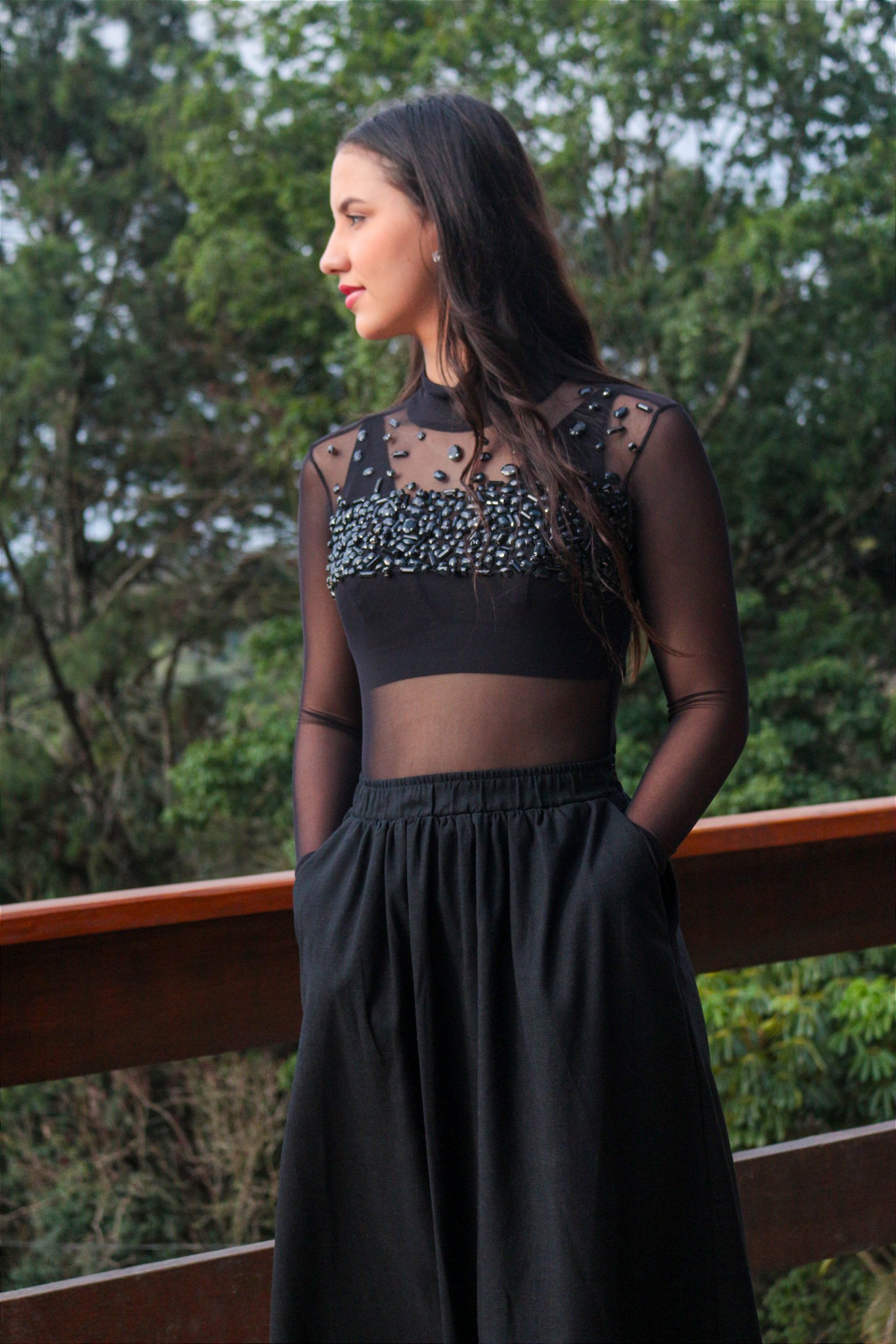 Body de mangas compridas e gola alta, feito em Tule Ilusion. Tecido muito macio e leve. Modelagem justa ao corpo. Possui Botões na gola para melhor ajuste e fecho entrepernas facilitando o uso. Traz bordado em Pedrarias na altura do Busto.