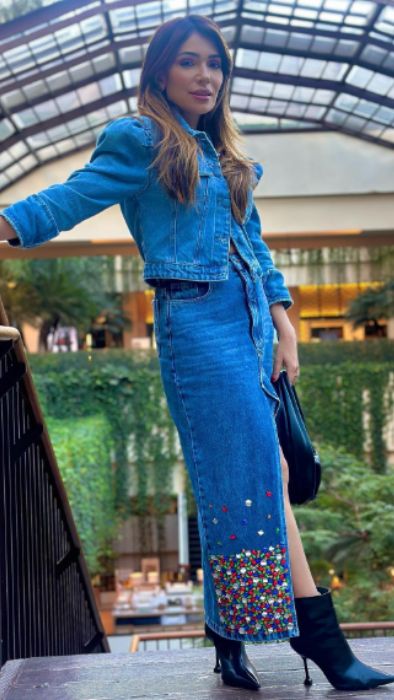 Saia mídi, com modelagem reta feita em Jeans de alta qualidade, com abertura frontal, bordado feito à mão em pedraria na barra. Bolsos laterais e traseiros. Fecho com ziper e botão metálico.